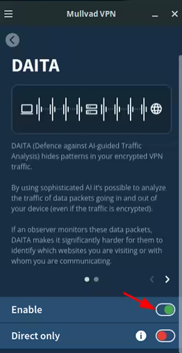 So in case if the adversary is monitoring your internet connection from the ISP point of view, they may notice when the connections to the D,E, and F, which could be used to potentially prove the existance of the sensitive VM, we also want to make sure that they can't see the connections that we're making to Tor, using a (you -> VPN -> Tor setup), by adding a VPN (with DAITA and multihop enabled) on the Host OS level: