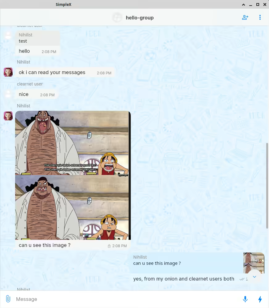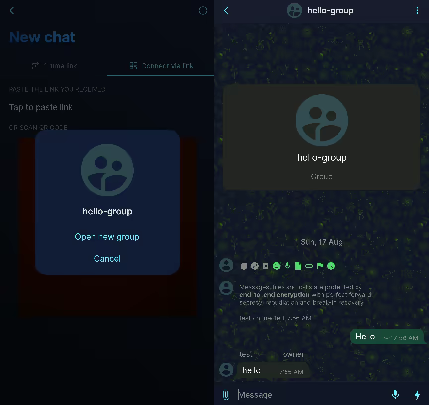And here I'm making a new group, then joining that group over the clearnet with my phone that uses only the default SimpleX servers, proving that I am not at all isolated from other SimpleX users even when using onion-only servers that only I own and operate: