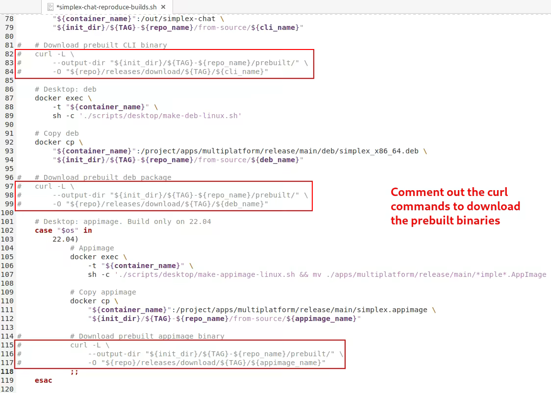 The SimpleX code base includes a script that will do exactly what we want. This script is meant to compare the pre-built binaries released by the SimpleX with the ones build locally as well, so we will have to modify the script slightly to take out that code. Additionally, the script will try to pull from the official Github repo instead of our personal Git server so we will have to change that too.