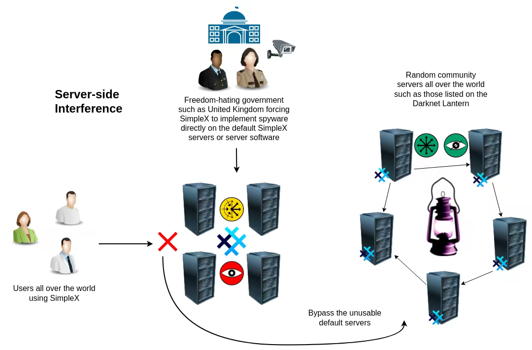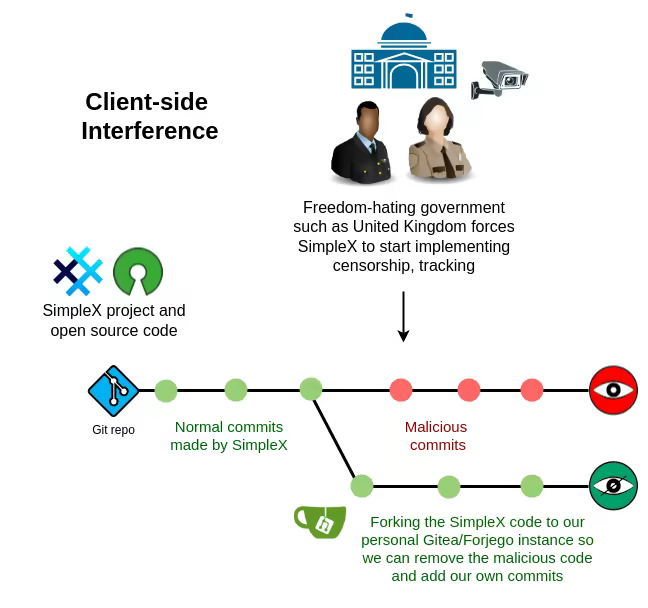 So hypothetically speaking, the UK government could come in at any time and demand that the SimpleX team start putting malicious code into the client application. But of course, as the application is FOSS, we can simply fork the code, remove the malicious commits, then continue on as if nothing happened. No approval or permission is needed.