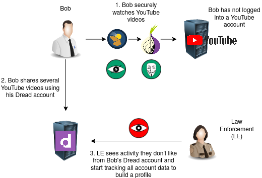 Let's say that Bob shares a bunch of YouTube videos related to different hobbies of his. Bob essentially handed law enforcement a copy of his watch list via the Dread account, even if he had perfect anonymity on the YouTube end. As explained in the anonymity blog, given enough information about an identity, law enforcement can uniquely identify it.